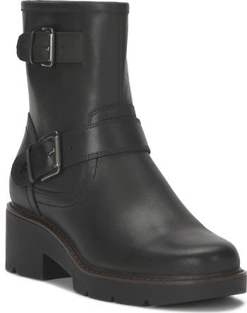 Twin buckle straps bring the perfect touch of moto edge to this sturdy block-heel bootie.