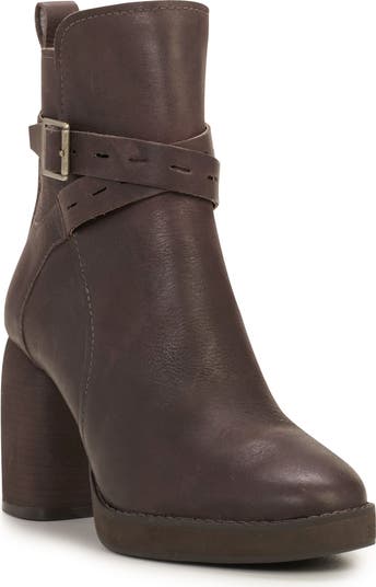 A rounded block heel elevates this side-zip bootie crafted from richly textured leather with a decorative strap encircling the shaft.