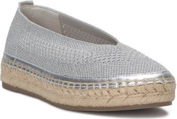 A stretchy knit upper offers optimal comfort and modern intrigue on a casual espadrille grounded by a jute-wrapped platform for a hint of height.