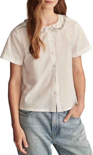 Faceted rhinestones sparkle from the Peter Pan collar of a crisp cotton shirt with a vintage look.