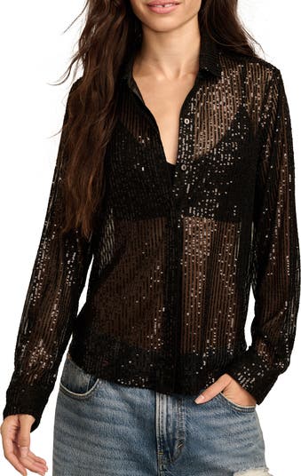 Shimmering sequins bring party-ready sparkle to a long-sleeve shirt cut from sheer mesh in a relaxed, easy-to-layer fit.