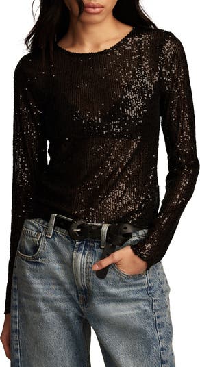 Shimmering sequins bring party-ready sparkle to a sultry long-sleeve shirt cut from sheer mesh.