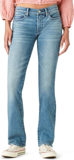 A subtle bootcut silhouette brings timeless appeal and flattering lines to comfortable stretch-denim jeans in a classically faded blue wash.