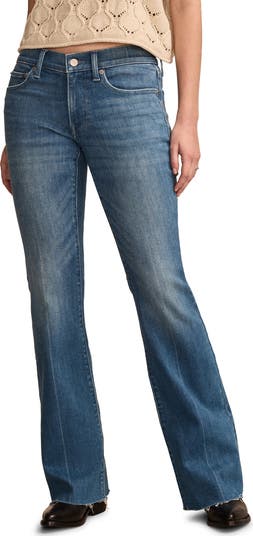 Slim through the hips and flared below the knee, these stretchy jeans feature a mid-rise waist and full-length legs for a casually dramatic look.