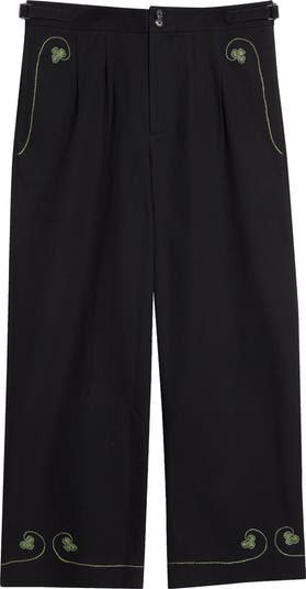 Inspired by playing card motifs popular throughout the late 1920s and early 1930s, these ankle pants are hand embroidered with a clover card suit from an antique tablecloth and vining strands of clover encircling the cuffs. They're cut from sturdy cotton twill with a mid rise and slightly widened leg and detailed with adjustable buckle tabs at the waist for a customized fit.