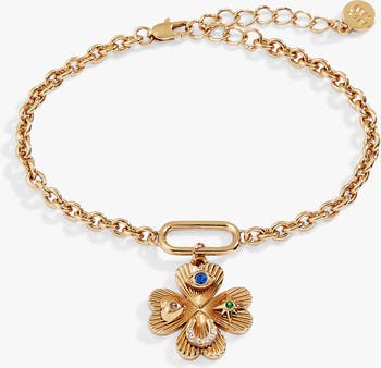Four-leaf clovers are iconic symbols of prosperity, believed to bring good luck to those fortunate enough to stumble upon them. Amplify your luck with this Lucky Symbols bracelet featuring a large gold-tone four-leaf clover with a sapphire glass crystal evil eye, a clear crystal horseshoe, an amethyst crystal-centered heart symbol and an emerald crystal star on an adjustable cable chain bracelet.