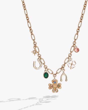Four-leaf clovers are iconic symbols of prosperity, believed to bring good luck to those fortunate enough to stumble upon them. Amplify your luck with this Lucky Charm Necklace featuring a large textured four-leaf clover with a sapphire glass crystal evil eye, a clear crystal horseshoe, an amethyst crystal-centered heart symbol and an emerald crystal star surrounded by Mother of Pearl and glass crystal detailed lucky symbols on an adjustable necklace.