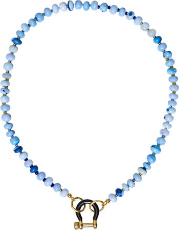 17 inch blue opal necklace with 14 karat gold plated hardware and enamel carabiner. Perfect for any occasion.