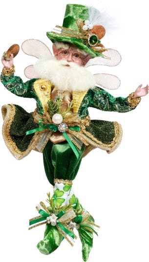 The Mark Roberts Lucky Leprechaun Fairy stands 11" tall with exquisite craftsmanship, featuring rich fabrics, detailed embroidery, and a whimsical expression full of charm. Holding a gleaming coin in his hand, he symbolizes good fortune, prosperity, and playful magic. Perfect for seasonal décor or a collectible display, this enchanting fairy brings a touch of Irish luck and fantasy to any space.