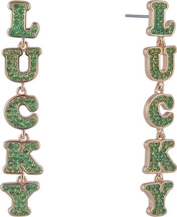 Bring a touch of sparkle and good fortune to your look with these dazzling green stone encrusted "lucky" linear earrings! Designed to shine, each letter is adorned with shimmering green glass stones that catch the light beautifully, making them the perfect festive accent for St. Patrick’s Day or a lucky pop of color any time of year. Fun, eye-catching, and full of charm, these earrings are sure to become a favorite.
