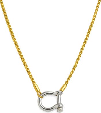 Elevate your accessory game with our Lucky Lock Two-Tone Carabiner Necklace. Designed with a unique horseshoe-inspired clasp, this bold yet refined piece features striking mixed-metal tones that add a touch of edge to your everyday elegance. Whether layered with other favorites or worn solo, its modern industrial vibe and lightweight feel make it a must-have statement for any collection.
