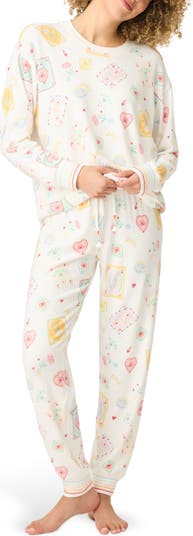 If you're searching for the perfect lazy-day jammies you're in luck—this pair offers cozy comfort in the label's signature-soft peached jersey featuring a print of good-fortune icons.