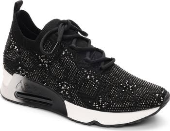 A flexible knit upper makes for easy on and off in a crystal-covered sneaker.