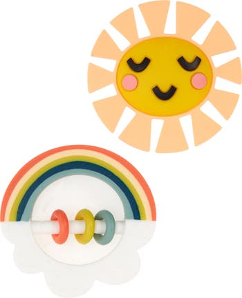 Keep your little one's day bright—even with sore gums—with this set of two teether toys featuring a darling rainbow and happy sun.