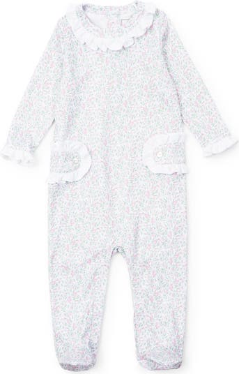 Long sleeved pima cotton footed one piece with ruffles around neck, collar and side plackets. Snaps in stride and back of neck. Made from 100% Peruvian Cotton.