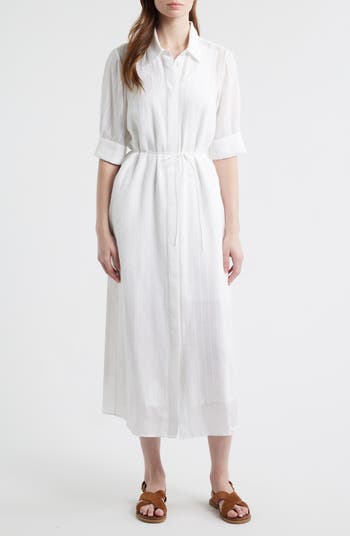 Stitched stripes enhance the texture of this maxi shirtdress framed by elbow-length sleeves and accented with a slender tie belt.