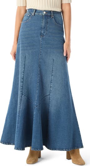 A swingy flared hem adds graceful movement to this stretch-kissed denim maxi skirt made in a faded indigo wash.