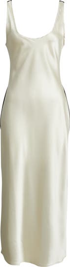 Build out your black-and-white collection with a slinky satin slipdress that reads dreamy creamy from the front and midnight black in the back.