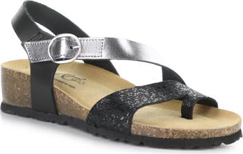Mixed-media straps and a stylish toe loop bring striking dimension to a faux-leather sandal set on a cork-wrapped platform and integrated wedge heel. A cushioned footbed and grippy rubber sole deliver comfort and stability.