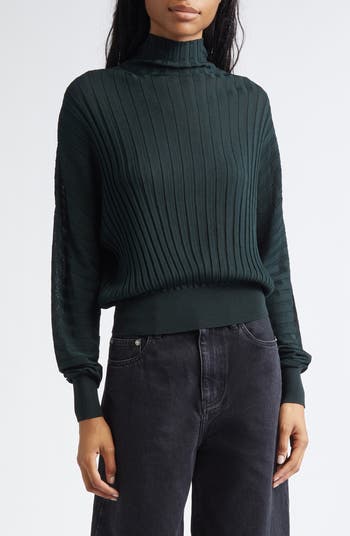 This ribbed sweater is knit in a lightweight, fine gauge and fashioned with shoulder seams dropped so low they create the relaxed appearance of dolman sleeves.