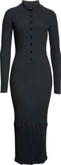 This curve-hugging sweater-dress is fashioned with the label's 'sunburst rib' technique—additional ribbing linked together at the knee, creating a dimensional flounce effect.
