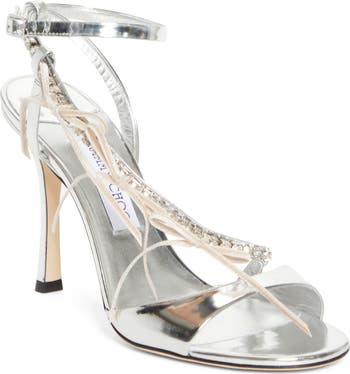 A masterclass in elegant minimalism, this metallic-leather sandal features a crystal- and bow-embellished asymmetric strap that wraps the foot to create a graceful silhouette.