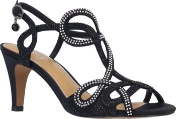 Mixed rhinestone embellishments adorn the intertwining straps on a glamorous slingback sandal set on a cushioned footbed and tapered heel.
