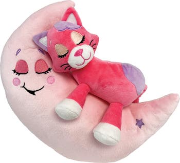 HAPPY NAPPERS: LULLABRITES MOON PETS - PINK CAT - This enchanting toy is more than just a plush; it's a magical sleep-time experience. Happy Nappers Lullabrites Moon Pets it’s 2 in ONE. Includes a little plush with a magic moon, so soft and cuddly. Place the magic plush on the Lullabrites moon and when they connect they play, Twinkle Twinkle Little Star, Brahms Lullaby and Hush Little Baby with color changing lights that twinkle and shine bright with lullabies to comfort you at night. The ideal soothing and comforting plush for little ones. Plush Nightlight: Not only is the moon a comforting nightlight, but it also becomes a favorite cuddly buddy. Press the star on the bottom once to start the lullabies and see the moon glow with a soft, colorful light. Press it again to keep the lights on without music, or press a third time to turn everything off for daytime play.