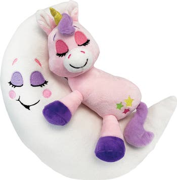 HAPPY NAPPERS: LULLABRITES MOON PETS - UNICORN - This enchanting toy is more than just a plush; it's a magical sleep-time experience. Happy Nappers Lullabrites Moon Pets it’s 2 in ONE. Includes a little plush with a magic moon, so soft and cuddly. Place the magic plush on the Lullabrites moon and when they connect they play, Twinkle Twinkle Little Star, Brahms Lullaby and Hush Little Baby with color changing lights that twinkle and shine bright with lullabies to comfort you at night. The ideal soothing and comforting plush for little ones. Plush Nightlight: Not only is the moon a comforting nightlight, but it also becomes a favorite cuddly buddy. Press the star on the bottom once to start the lullabies and see the moon glow with a soft, colorful light. Press it again to keep the lights on without music, or press a third time to turn everything off for daytime play.