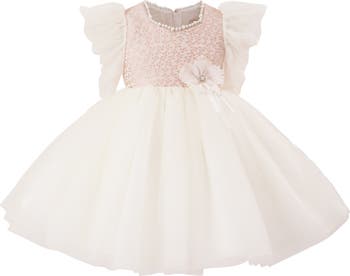 A dazzling design that balances sparkle with softness, making it ideal for birthdays, weddings, or other formal celebrations. The thoughtful details bring both elegance and charm to every special moment. Sequined bodice with pearl neckline and sheer ruffled sleeves. Voluminous layered tulle skirt accented with a delicate floral detail.