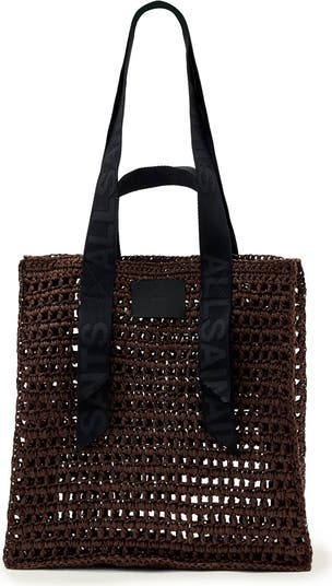 A crochet-inspired open weave lends rich texture and summery vibes to this spacious paper-straw tote finished with jacquard-logo fabric straps.