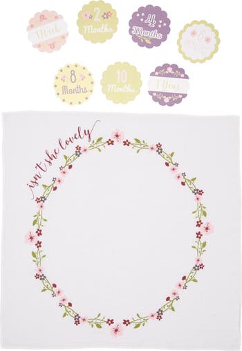 Sweet flowers blossom on a cotton-muslin blanket that comes with 14 coordinating cards to mark growth milestones in baby's first year.