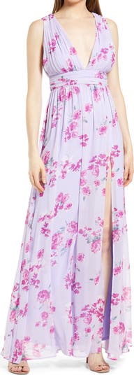 Beautiful bundles of flowers add to the romance of a floor-pooling evening gown with a plunge neck and full skirt.