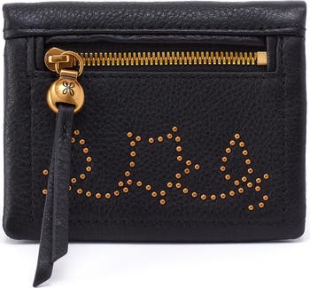 A compact wallet in smooth leather with intricate stitching and sparkling beadwork is sized to fit all of your cash and plastic essentials, with an outer coin pocket and ID sleeve for added convenience.