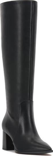 A clean-lined silhouette with minimal detailing brings wardrobe-spanning versatility to this leather knee-high boot framed with a pointy toe and block heel.