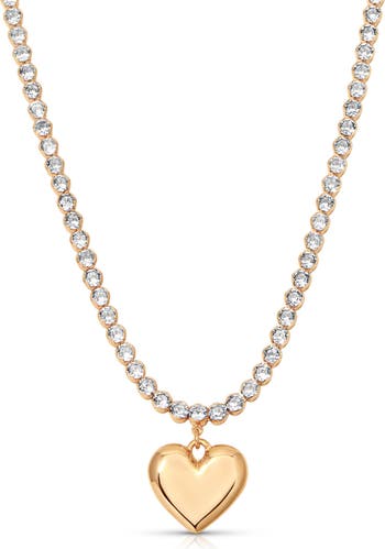 Sparkling crystal bezels lead to a puffy heart pendant that centers this necklace with gleaming romance.