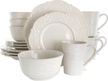 Add a touch of elegance to your dinner table with the Elama Luna 16 Piece Embossed Scalloped Stoneware Dinnerware Set in White. Every dish in this collection is crafted from quality stoneware, decorated with embossed designed and scalloped edges, and finished in a glossed glaze. This tableware collection comes with a full service for four including; four dinner plates, four salad plates, four bowls, and four mugs. Each plate in this set is both dishwasher and microwave safe for easy cleaning and everyday use.