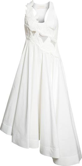 The spring 2026 collection, Kindred Spirit, delivers an ethereal cotton midi dress featuring a flight of quilted dove appliqués, mesh cutouts and an symmetric hem.