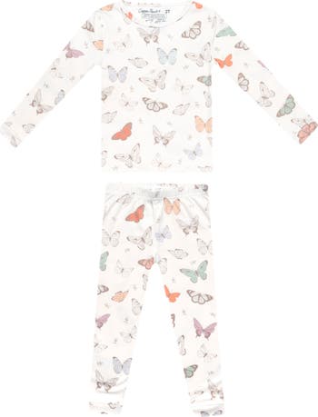 Delicate butterflies flit about on these soft and stretchy pajamas made from lightweight fabric.