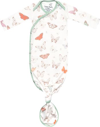 Delicate butterflies flit about on a soft and stretchy knotted gown that's a great choice for newborns with easy-on/off snaps and fold-over mitts.