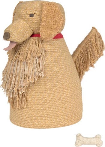 Shaped like a Golden Retriever pup, this shaggy basket is perfect for toy storage or for little hands that like to put things inside and take them out again. The head (or basket lid) features canvas-lined ears, carefully hand-knotted eyes with fluffy eyebrows for a sweet, expressive look and an interactive snout with a roll-out tongue to carry a small bone.