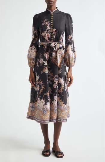 An engineered paisley print brings swirling pattern to this long-sleeve linen midi dress from the spring '26 collection, Kindred Spirit. Bejeweled flower buttons lead to a high mandarin collar on the romantic design framed with balloon sleeves and cinched with a silk-scarf sash.