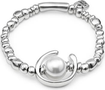 Unique design elastic bracelet made with round beads that combines a silver-plated hoop and a white pearl.