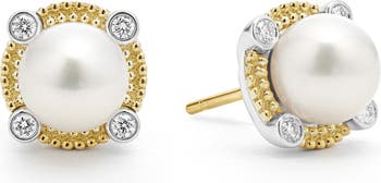 Caviar-beaded frames hold luminous pearls and sparkling diamonds in these modern-meets-classic stud earrings.