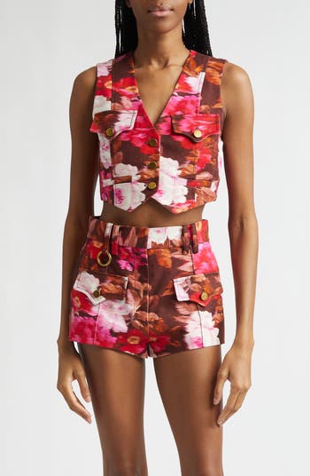 A hazy ikat print of romantic roses on a chocolate ground brings rich nostalgia to this cropped cotton drill waistcoat fitted with an adjustable buckled half belt in back. Brass logo buttons and pointed pocket flaps bring an extra pop of personality to this statement piece.
