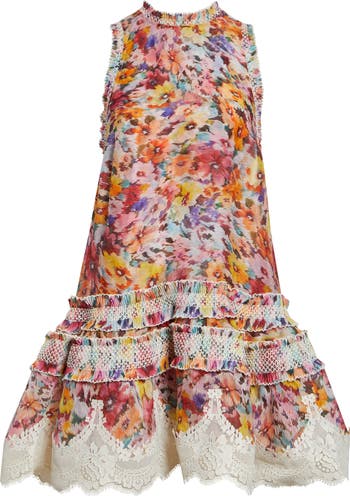 Vibrant blooms bring the season's bohemian energy and summertime happiness to this high-low minidress that was featured on the runway for the label's spring '26 collection. The breathtaking style is crafted from textural linen-and-silk organza and is embellished with smocked ruffles and lacy trim on the full, flared skirt.