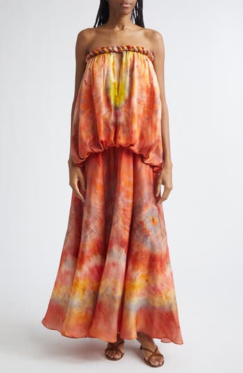 You'll feel like a Grecian goddess in this satiny silk gown printed in a warm, bright tie-dye pattern and edged with ropy twisted trim at the off-the-shoulder neck. A voluminous blouson bodice flows beautifully with simple slits in the sleeves and an alluring V-cutout at the neck.