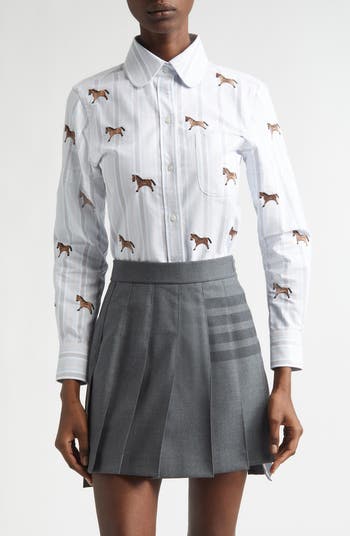 Ride into the Year of the Horse in polished, equine grace wearing this classically striped oxford topped in a satin-stitched horse motif, giving you a winning look.