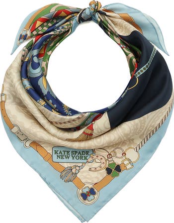 A patterned horse representing the 2026 Lunar New Year is framed in an equestrian-themed border on this square silk scarf that can be worn multiple ways.