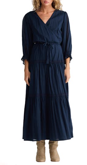 Pure prairie breezes waft through a tiered cotton dress offered with ruffled sleeve cuffs and the perfection of a pair of pockets.